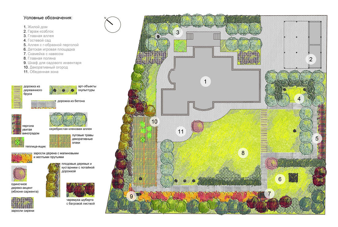 Задача: реконструировать существующий сад, сохранить существующее мощение, использовать уже посаженные хвойные растения в новом саду, обозначить место для плодовых кустарников и декоративного огорода, а также предусмотреть домик для детей, игровой холм и поляну.