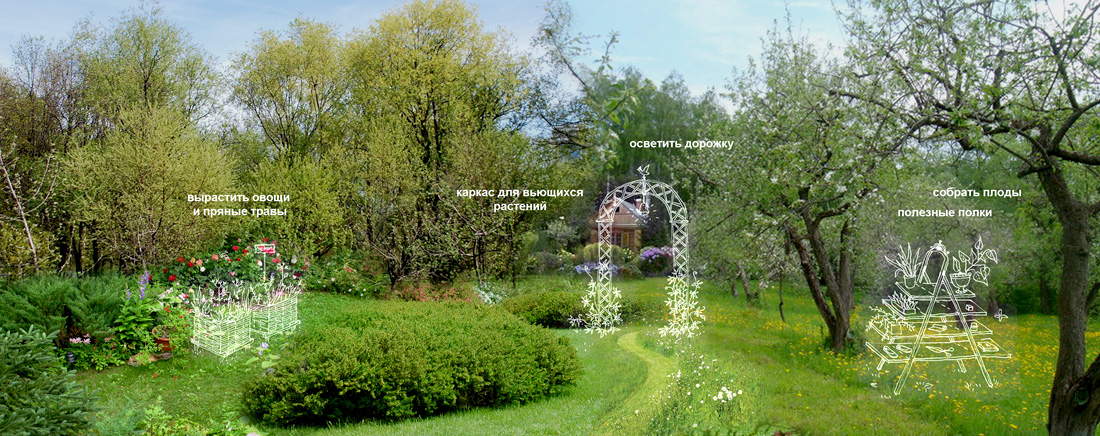 Подобные вещи можно изготовить самостоятельно (при наличии необходимых навыков) или заказать мастеру по дереву или ковке. Учитывая нестационарное размещение таких объектов, вы можете делать в своем саду "перестановку", добавлять что-то новое или совершенствовать то, что есть. В период холодов, когда почти нет зелени, декоративные элементы и скульптуры создадут необходимые акценты на фоне неброского сада.
